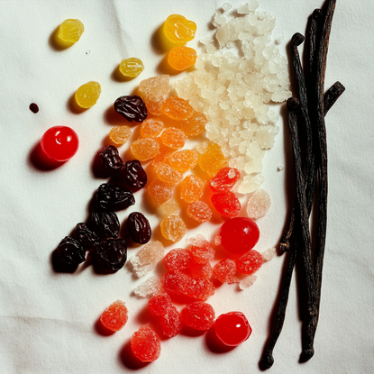 Candied fruits, rich sweet raisins and maraschino cherries, with a touch of vanilla and malt.